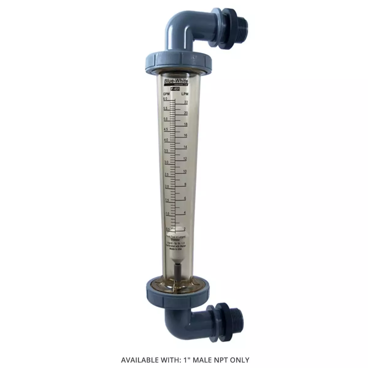 Blue-White's F-451001LHNE flowmeter has a scale range of 1 to 10 GPM and 4 to 40 LPM with 1" - F/NPT pipe size and adapter type, Polysulfone adapter material - 90° Elbows for Panel Mount Installation (M/NPT all models but the F-451006 F/NPT) - Item #: 16207-003 (F)