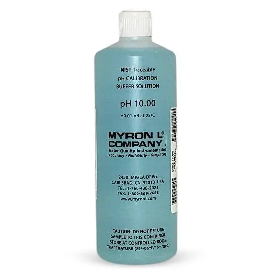 pH Buffer Solutions 4, 7 and 10 are mold inhibited and accurate to within + 0.01 pH units @ 25°C. Myron L® Buffers are traceable to NIST certified pH references and are color-coded for instant identification.