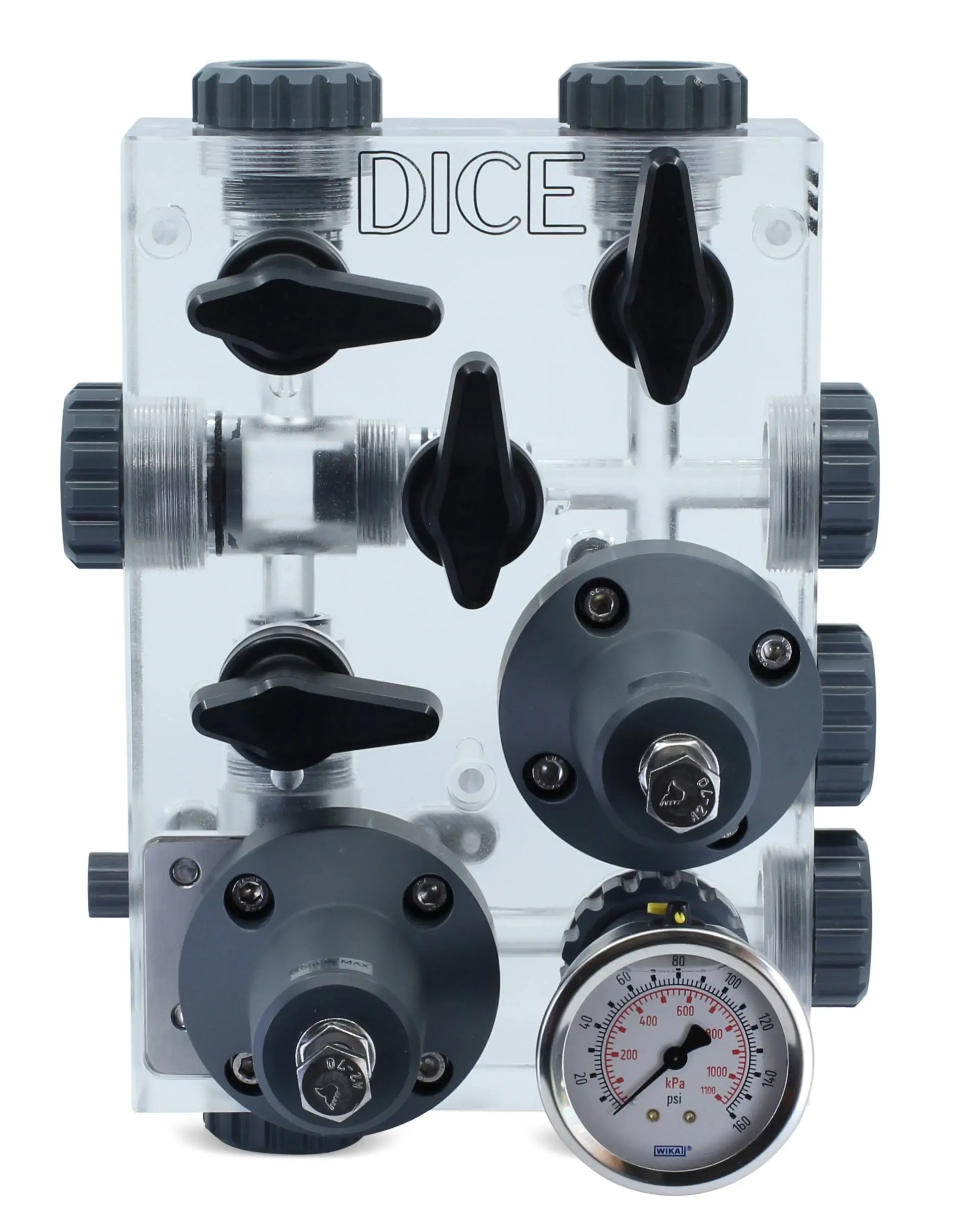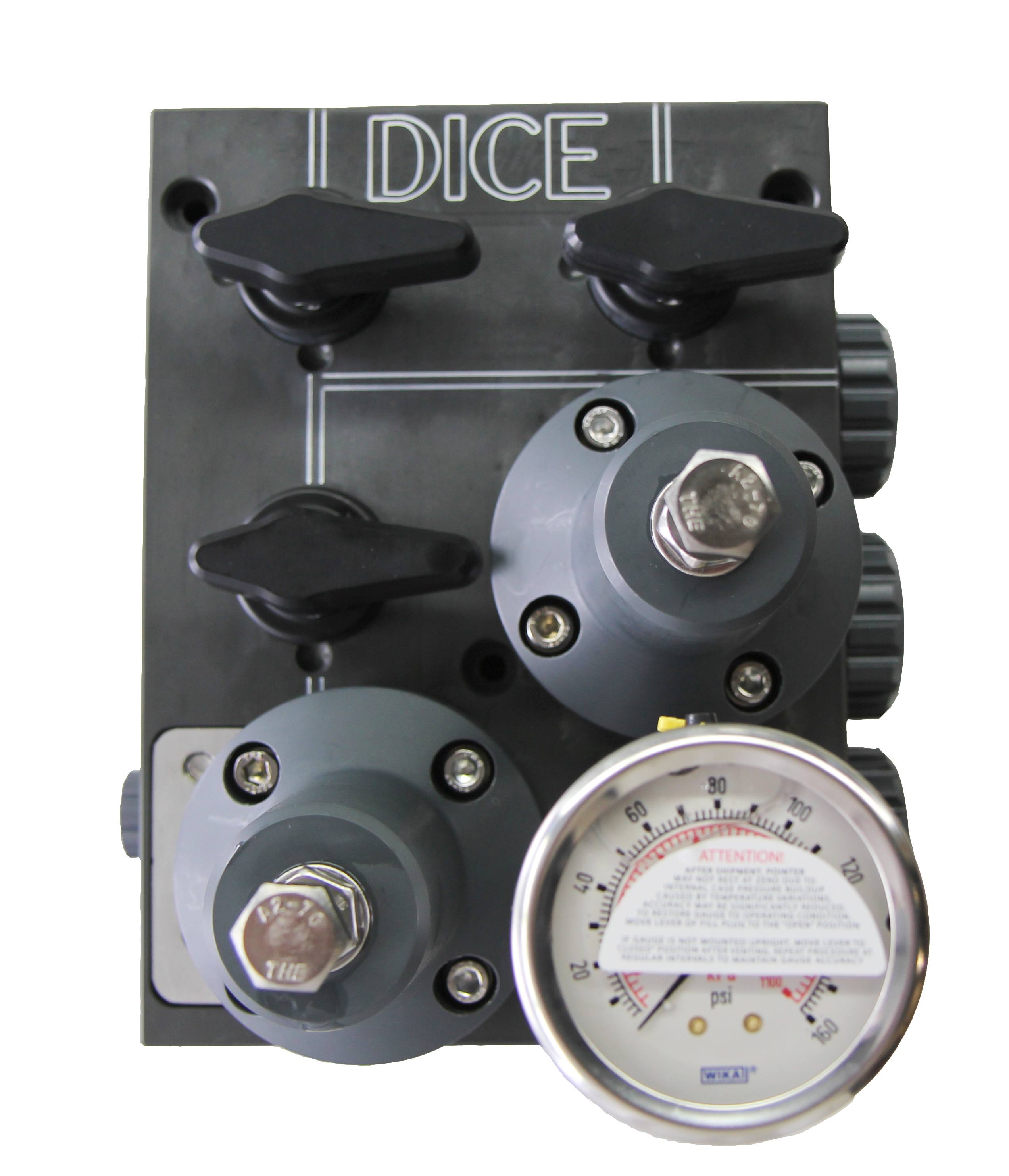 Meunier Technologies DICE DM DIM21-VVEE-2222444Z4 for flooded suction applications is configured with 1/2 in ports up to 150 PSI with material selections of PVC - PVC - EPDM for the block, valves, and seals with connections for 1/2'' FNPT