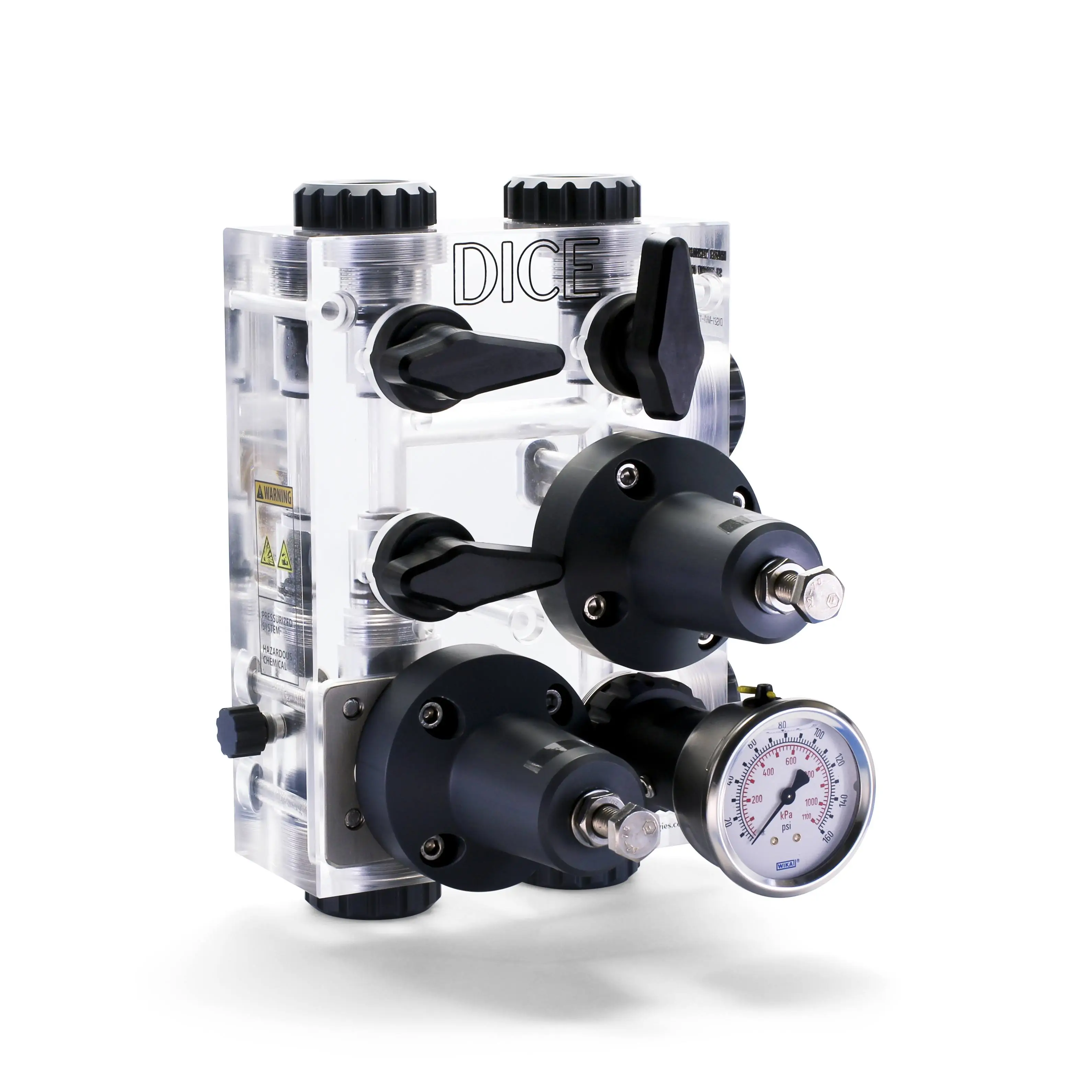 Meunier Technologies DICE DS DIS21-MVII-2222444Z for suction lift applications is configured with 1/2 in ports up to 150 PSI with material selections of Acrylic - PVC - Viton for the block, wetted parts, and seals with connections for 1/2'' FNPT